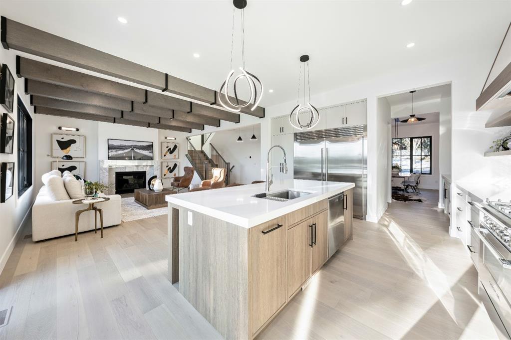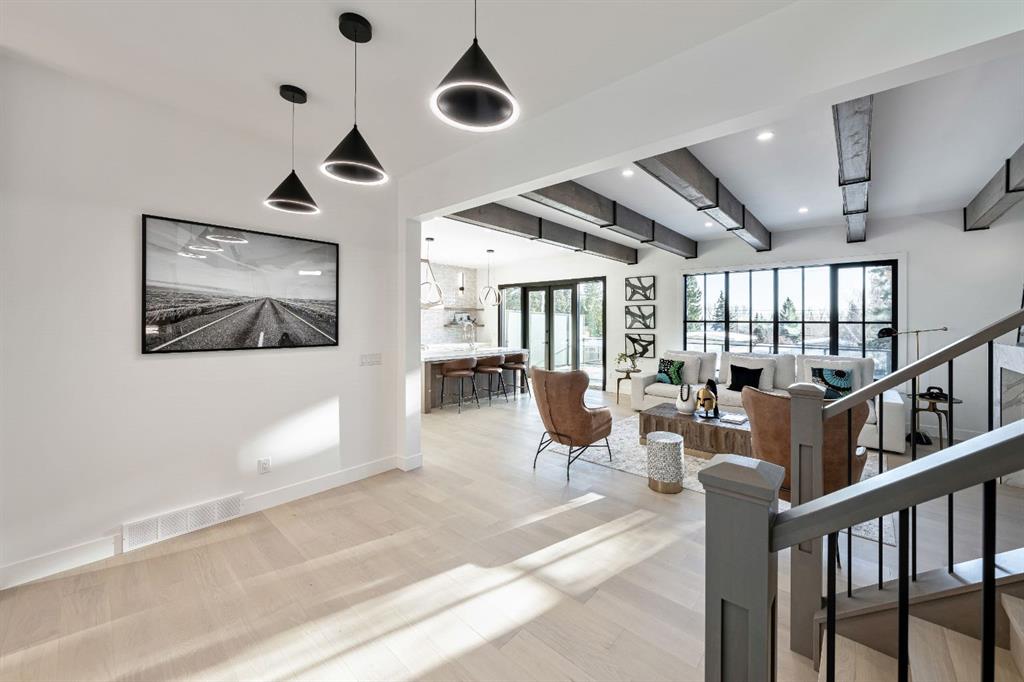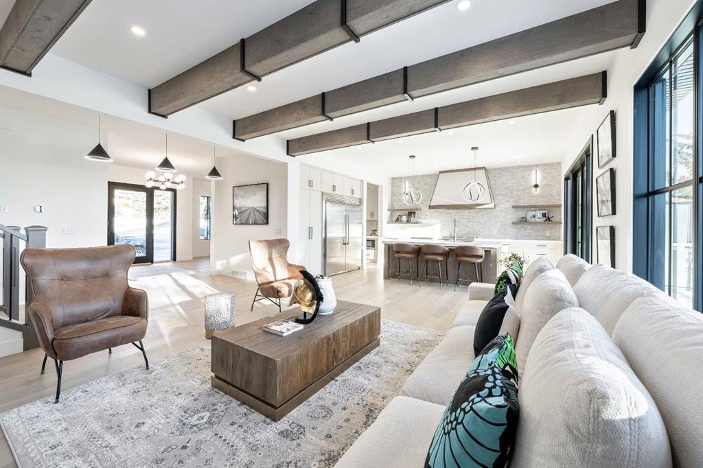 Stunning and unique best describes this modern masterpiece built by Elite Urban Concepts that draws inspirations from the wineries of California with a modern flair that checks all the boxes on one’s wish list. With over 4800 square feet of developed space and a fully finished walkout basement, there is plenty of room for a family, entertaining, working from home or relaxing on the weekends. With an open floor concept, you are immediately welcomed with hardwood floors that are complimented with the tall ceilings adorned with open beams in the living room and, tons of natural light from the abundant black cased windows. A large chef inspired kitchen that features beautiful hood fan as the centerpiece, accented with stainless-steel appliances, a separate butler pantry and, large custom wood cabinets that opens to a massive upper deck overlooking the backyard with a mountain view. Upstairs is perfect for family living with a bonus room that is central to an upper laundry room, two bedrooms and, a primary bedroom all of which have their own ensuites. Yes, you read that right, each upstairs bedroom has its own private ensuite. The primary bedroom is enormous with tons of natural light, vaulted ceilings with open beams, a view of the mountains and, a custom walk-in closet that will accommodate anyone’s needs. The beautifully crafted master ensuite features a spa like experience with large tile, wood accents, a soaker tub and a twinned shower that rivals a high-end hotel. The walkout basement is custom built for entertainment with tall ceilings accented with open beams, a custom-built stylish bar and a huge family room that has double French doors to the lower covered patio and fenced backyard, for that indoor outdoor flow. The additional open style room allows for your home gym that will take advantage of the natural light. The basement mudroom has an abundant amount of storage that leads out to the attached garage. The triple garage is large enough for your vehicles and toys. This beautiful gem in the heart of Charleswood is the perfect location, across from a park overlooked by Nose Hill Park, the location is perfect. MLS®: A2280624 - Charleswood 2 Storey $2,579,900