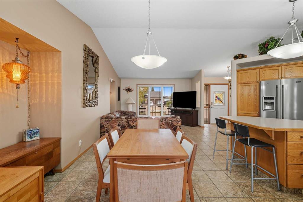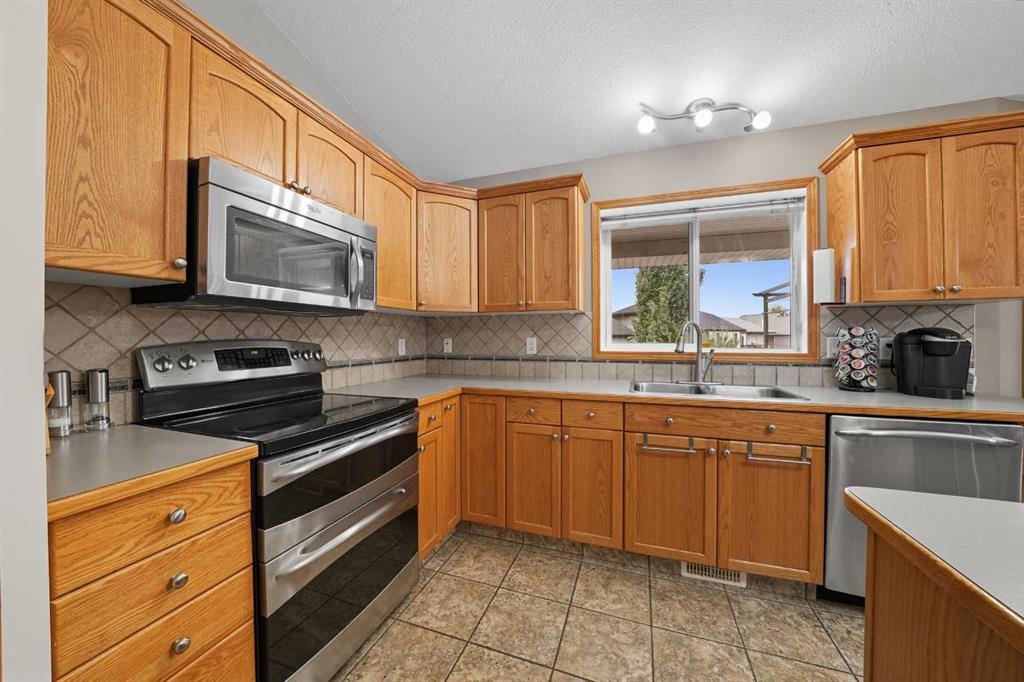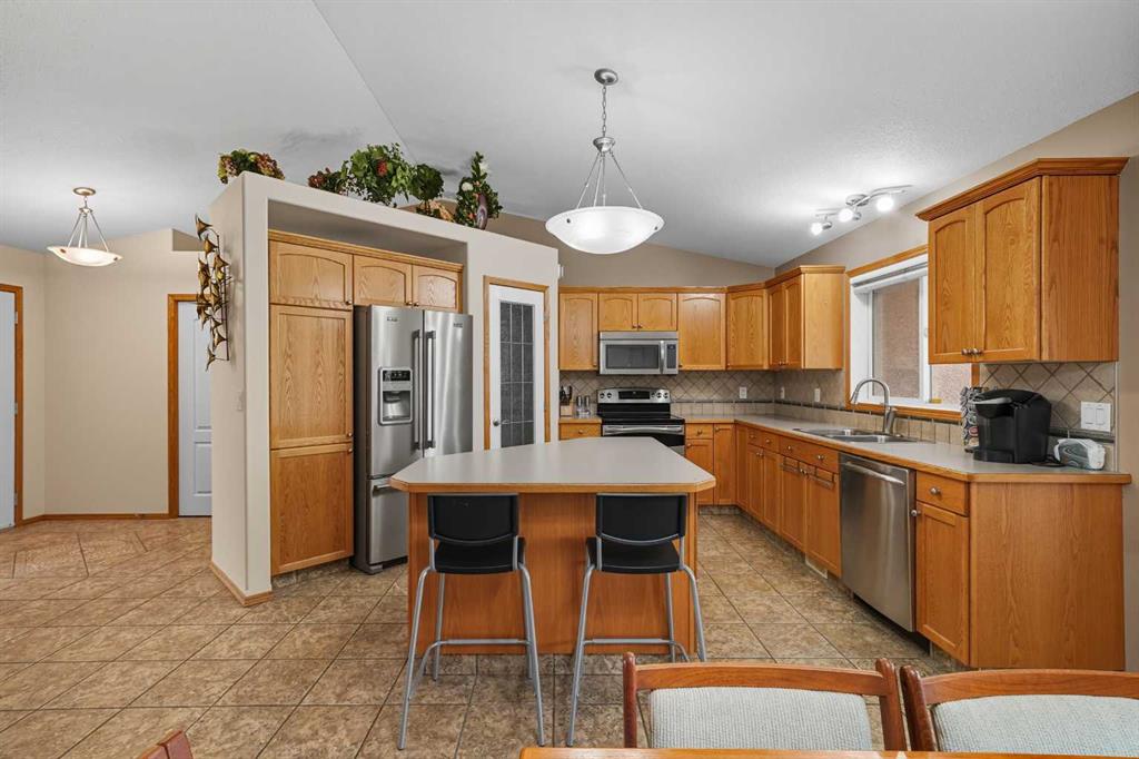 This stunning walkout bungalow not only has all the bells and whistles but also located in a quiet picturesque cul-de-sac. The main floor is an open concept with vaulted ceilings in a bright living room and a spacious dining room. Main floor has ceramic tile throughout. The kitchen has a large island with an abundance of cupboards, a large corner pantry, stainless steel appliances and a built-in wine rack. The dining area has space for a large dining table and a spot for a custom china cabinet. The living room has a spot for a 2nd fireplace, if desired. The upper level has two bedrooms, one being the master bedroom with a huge walk in closet and a three piece ensuite. The lower level has been freshly painted and has a fireplace, wet bar area and a large family room. There are two additional bedrooms both with walk-in closets and another three piece bathroom. There is also plenty of storage and in floor heating in both the lower level and the garage. The house is equipped with a water purification system, central air conditioning and outdoor hot water taps. The front yard is professionally landscaped and the backyard is maintenace free with RV parking and hookups (water & electric), a nice garden area, large storage shed and natural gas hookups on both upper and lower decks. This home has many features for a new owner to enjoy. Hurry call your realtor today. MLS®: A2269698 - Westpark Meadows Bungalow $499,900